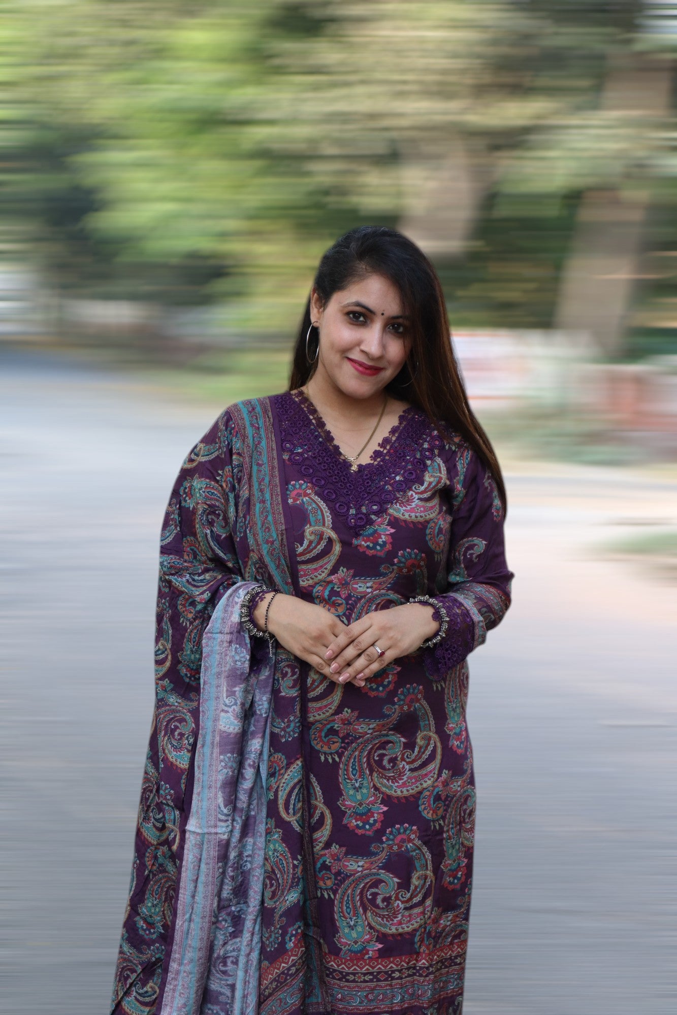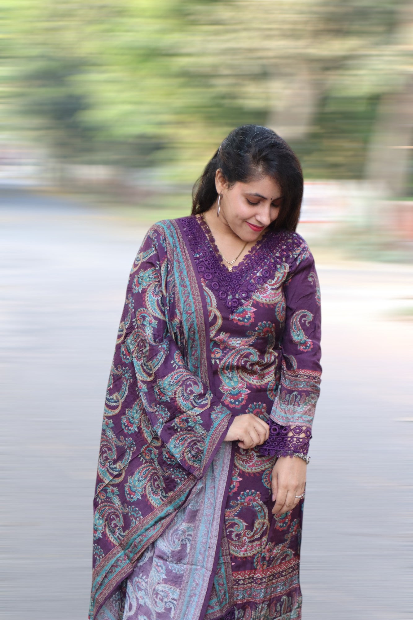 ISHI 528 Beautiful Dark Purple Color in Pure Muslin Straight 3 Pcs Suit