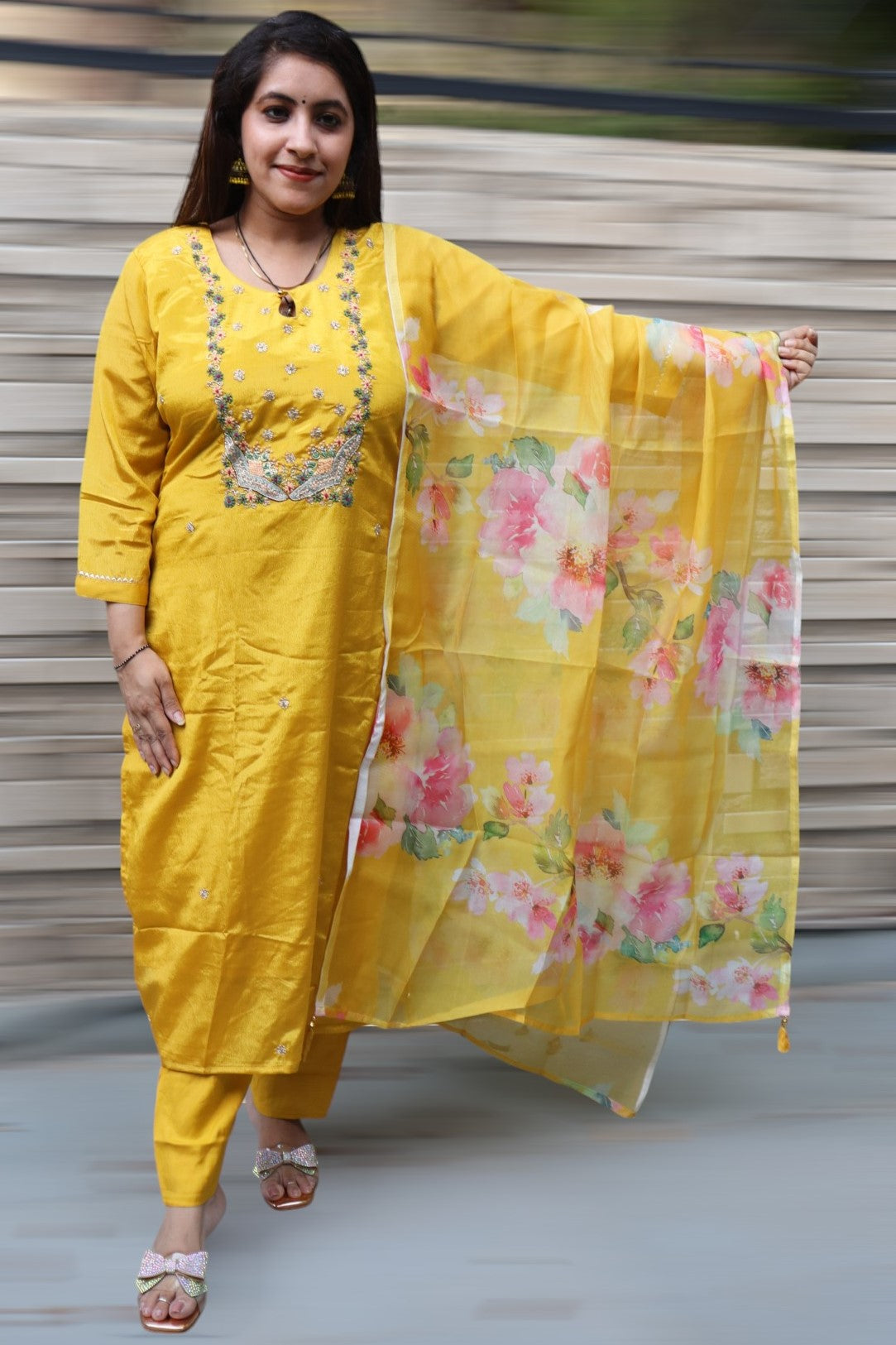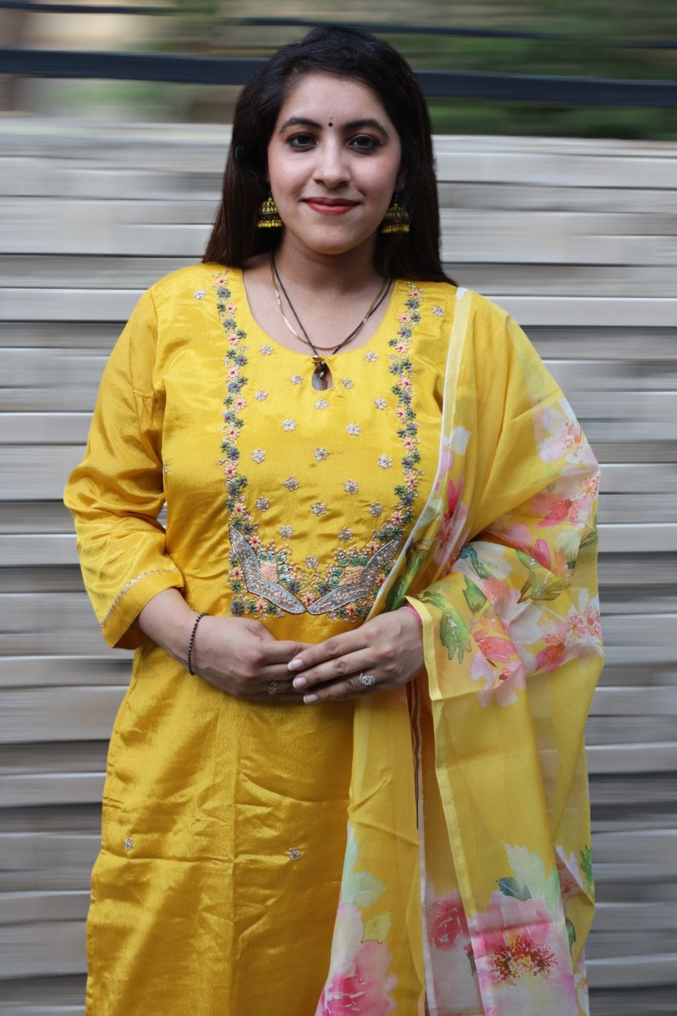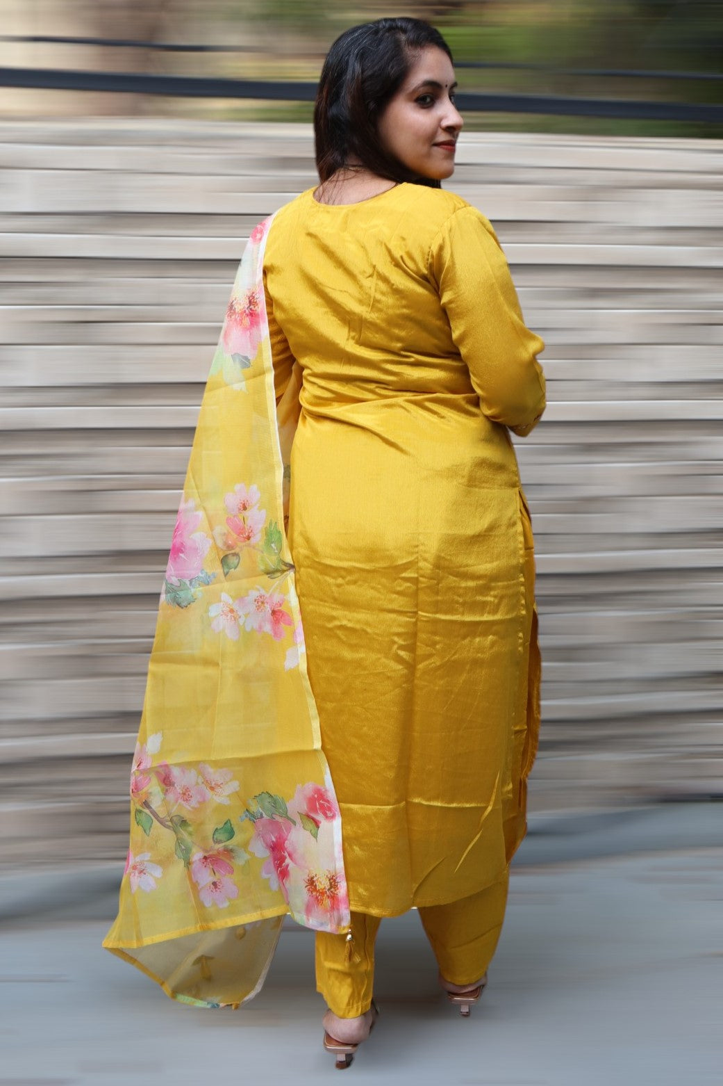ISHI 562 Beautiful Yellow Color Chinnon Partywear Straight 3 Pcs Suit