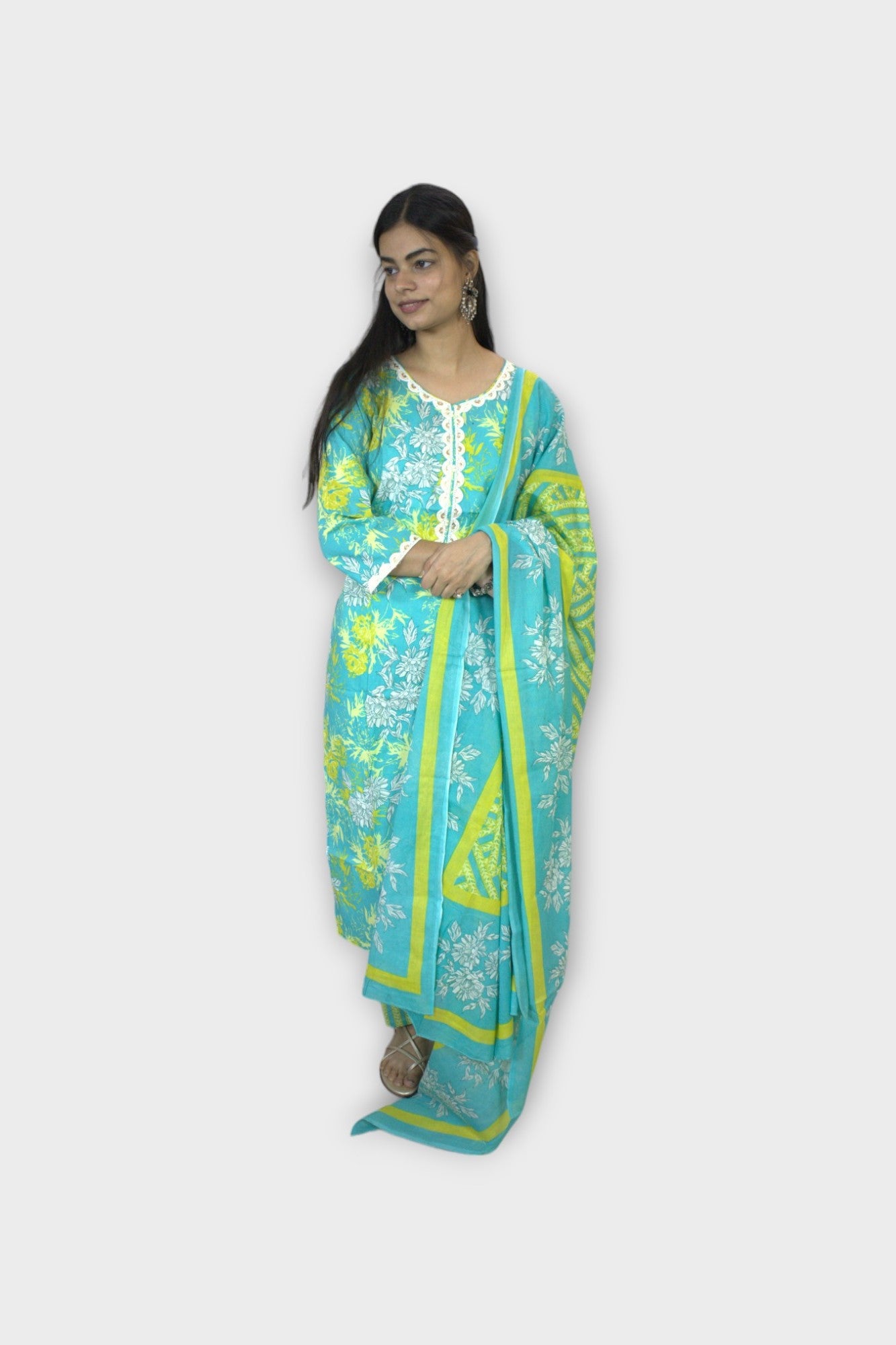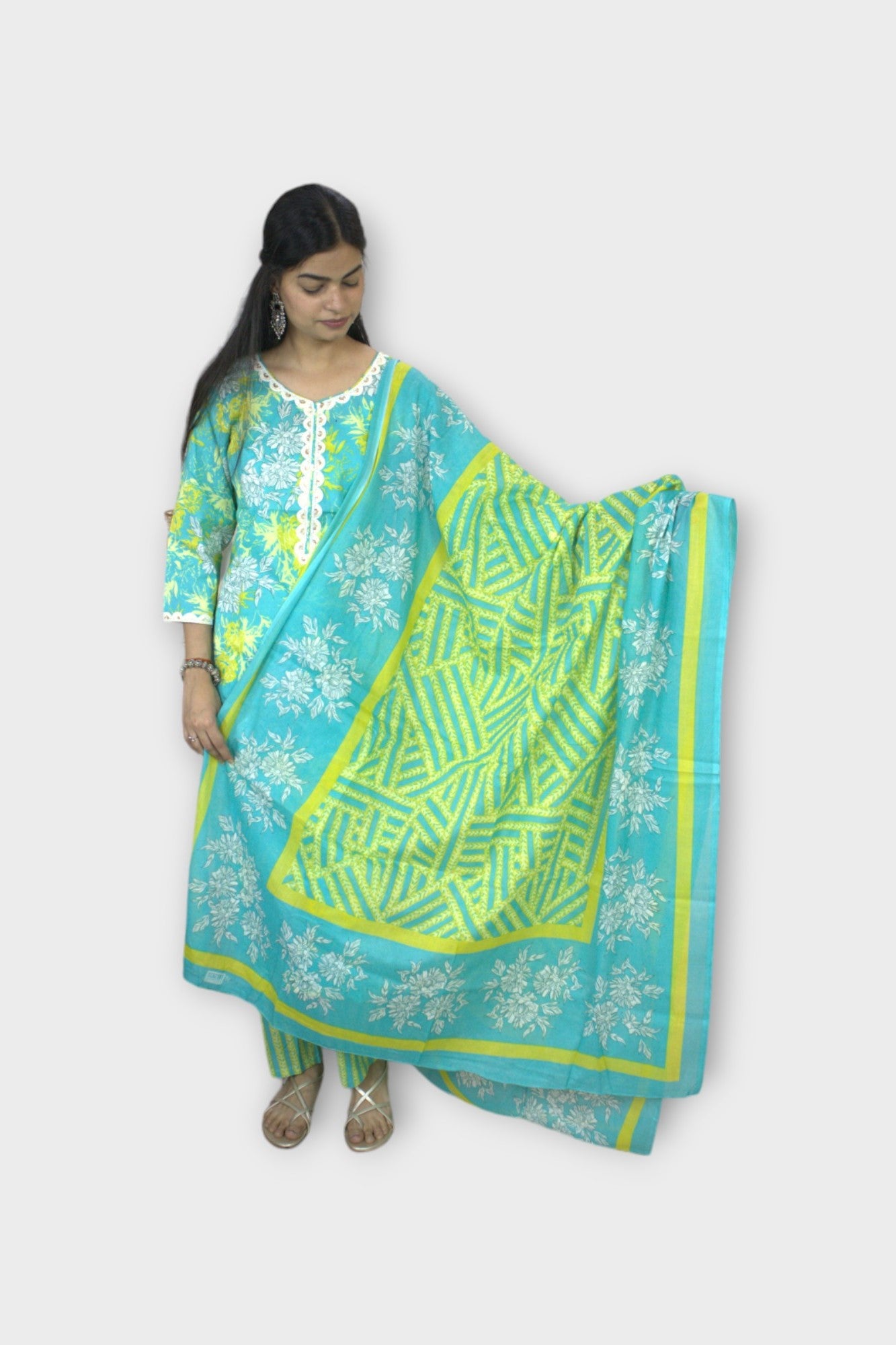 ISHI 560 Beautiful Green Color Cotton Straight 3 Pcs Suit