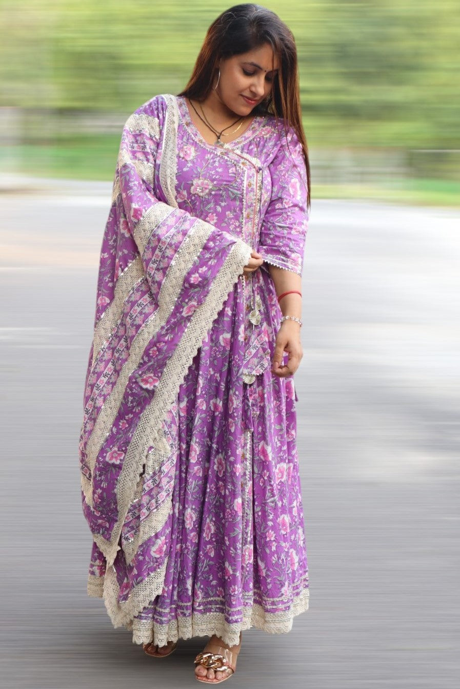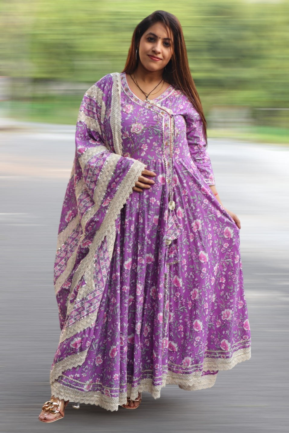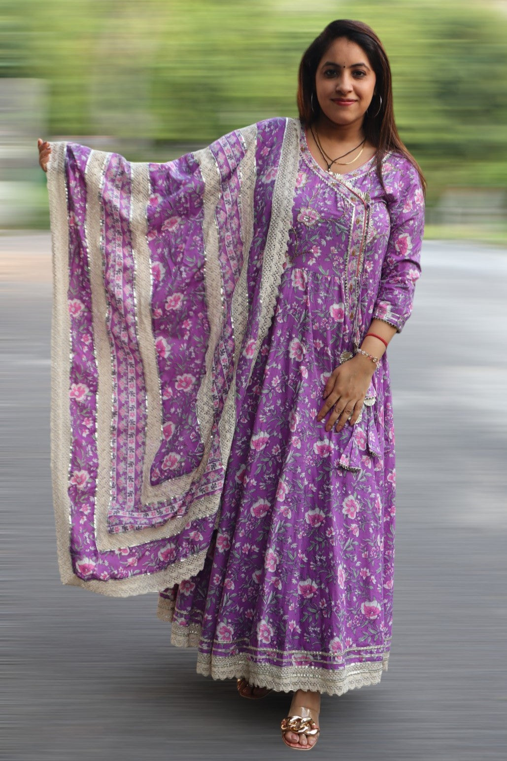 ISHI 645 Beautiful Designer Purple Color Floral Printed Cotton Anarkali 3 Pcs Suit