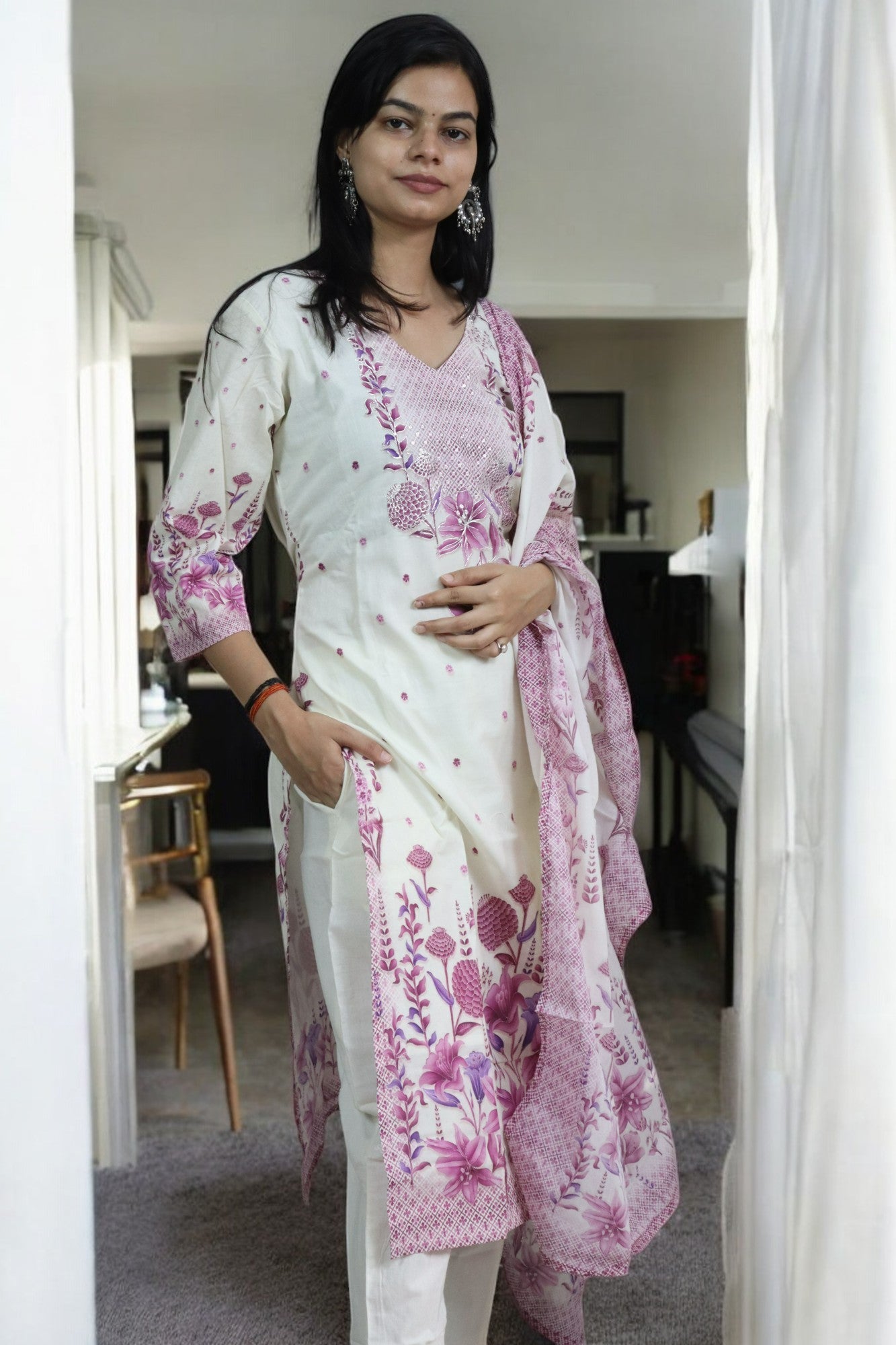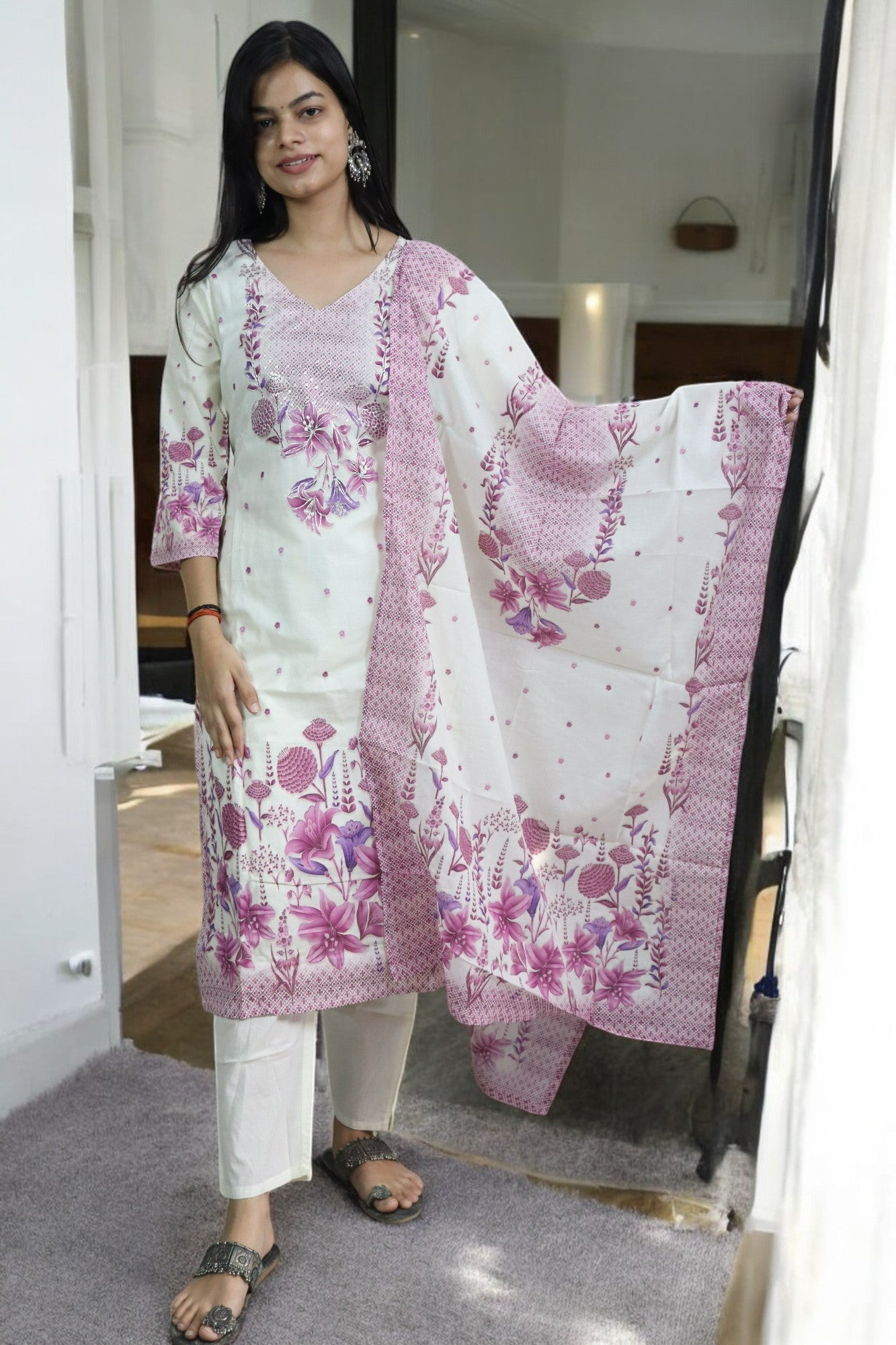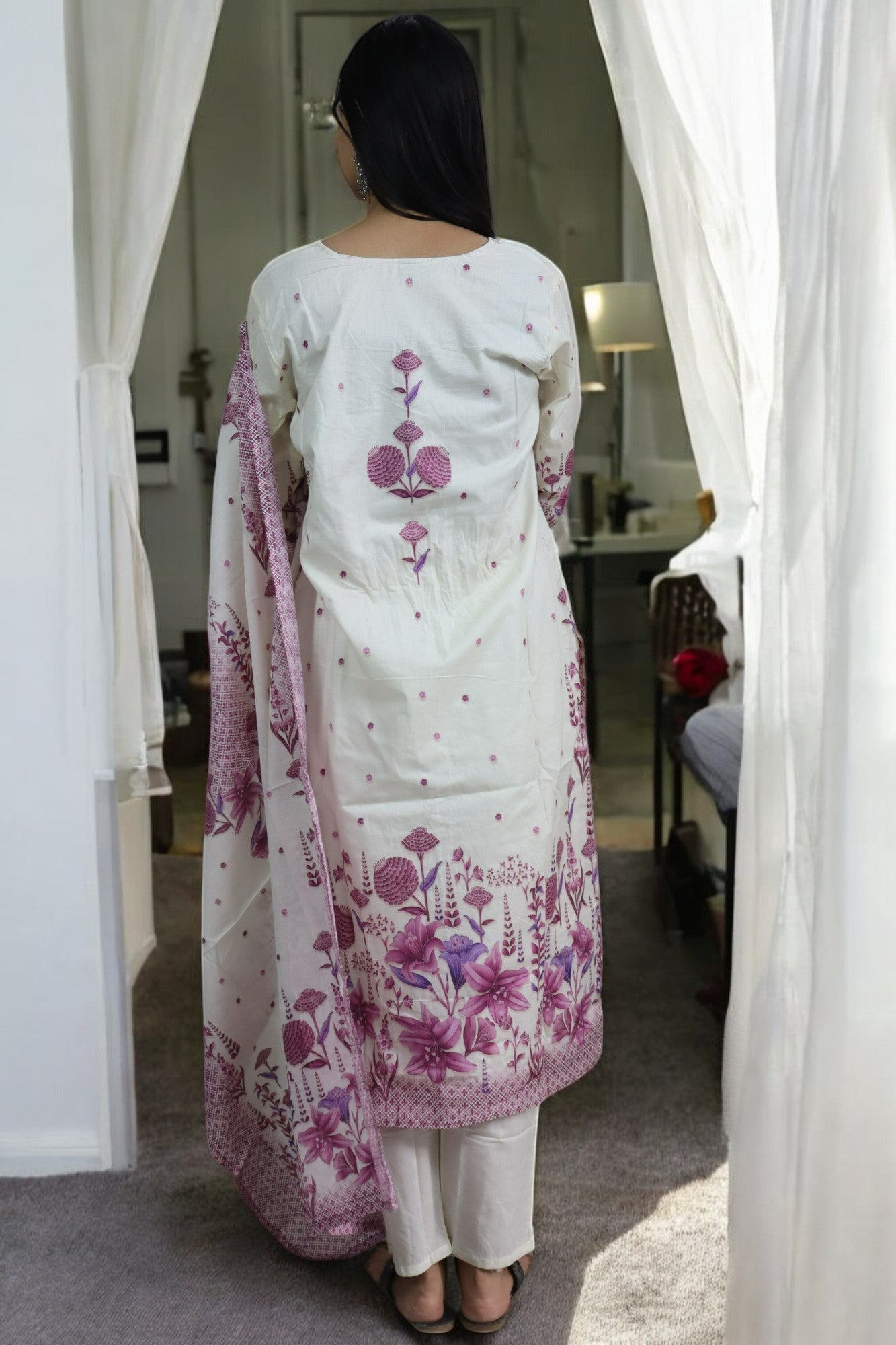 ISHI 704 Beautiful Off White Color Cotton Floral Printed 3 Pcs Suit