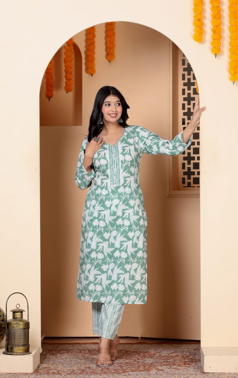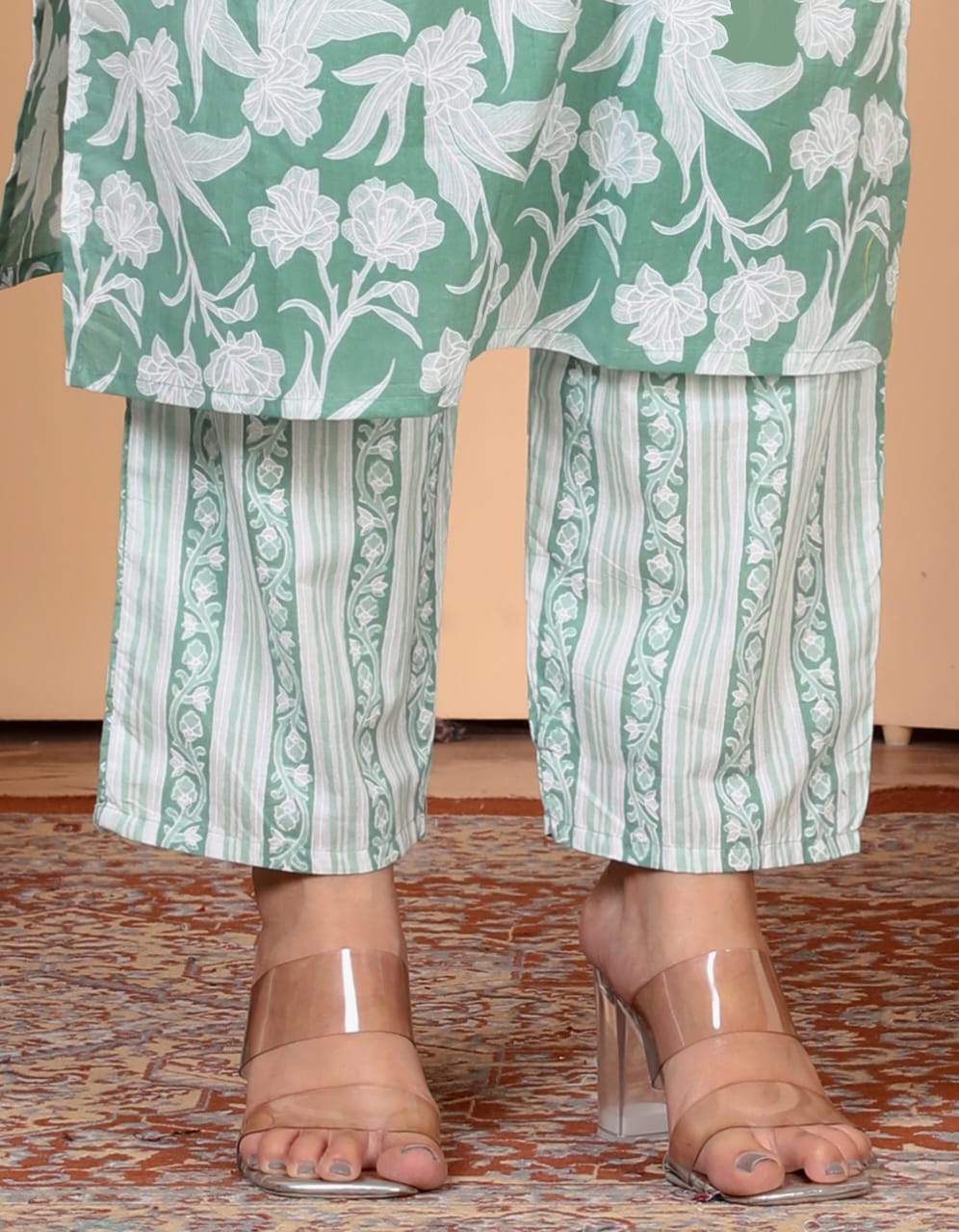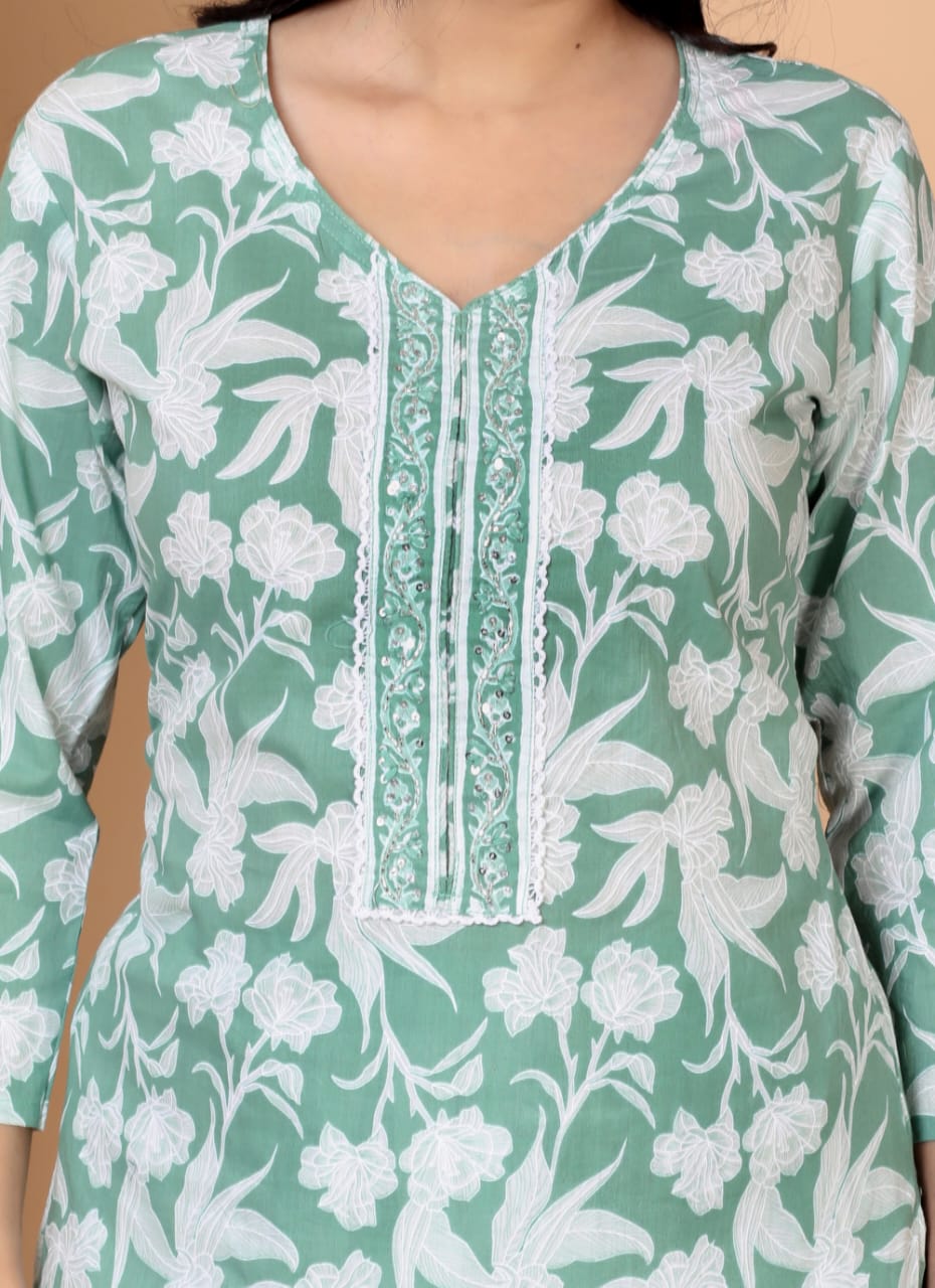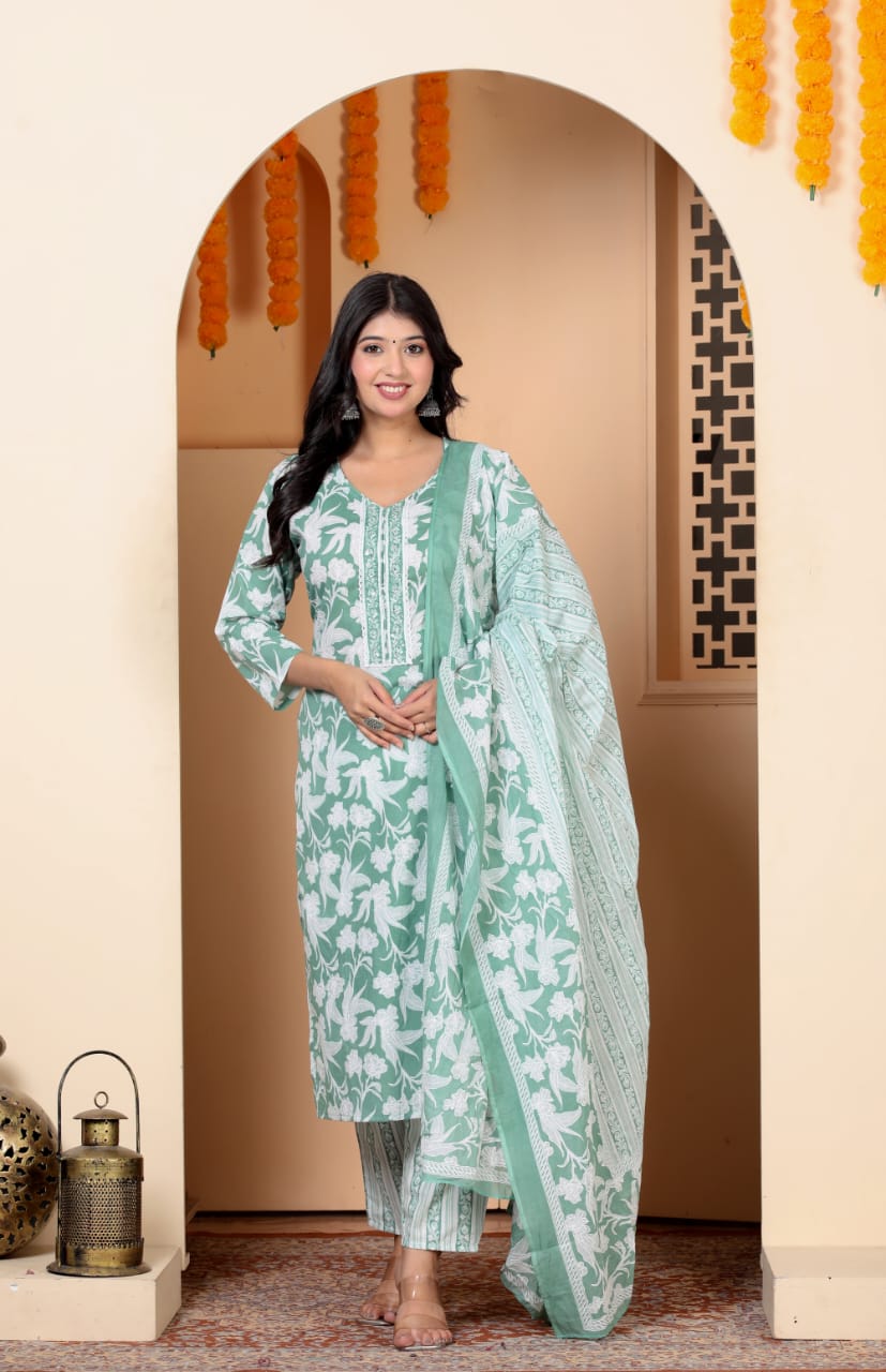 ISHI 727 Beautiful Green Color Floral Cotton Straight 3 Pcs Suit
