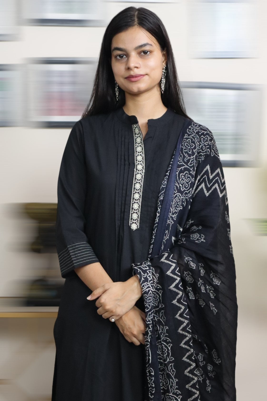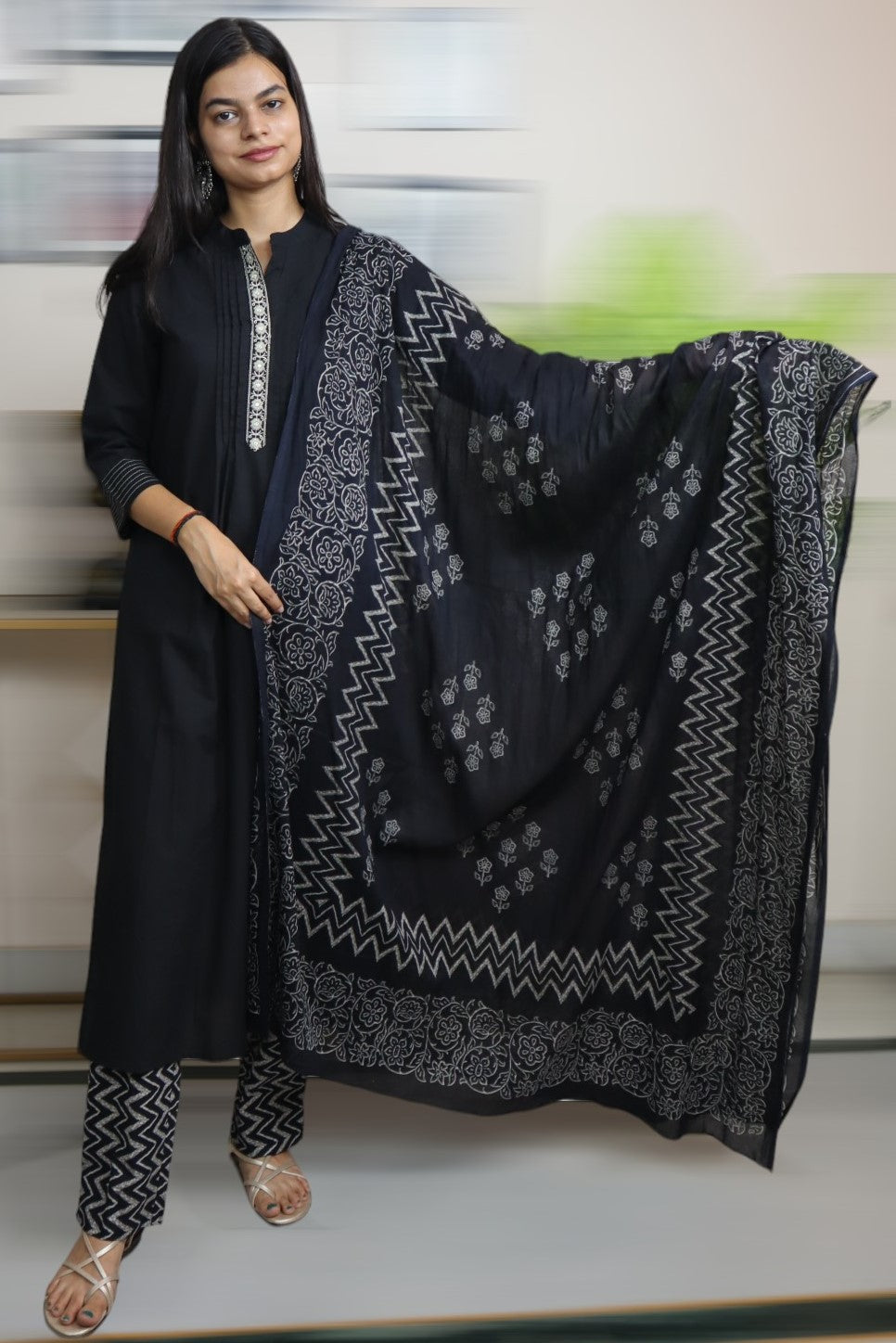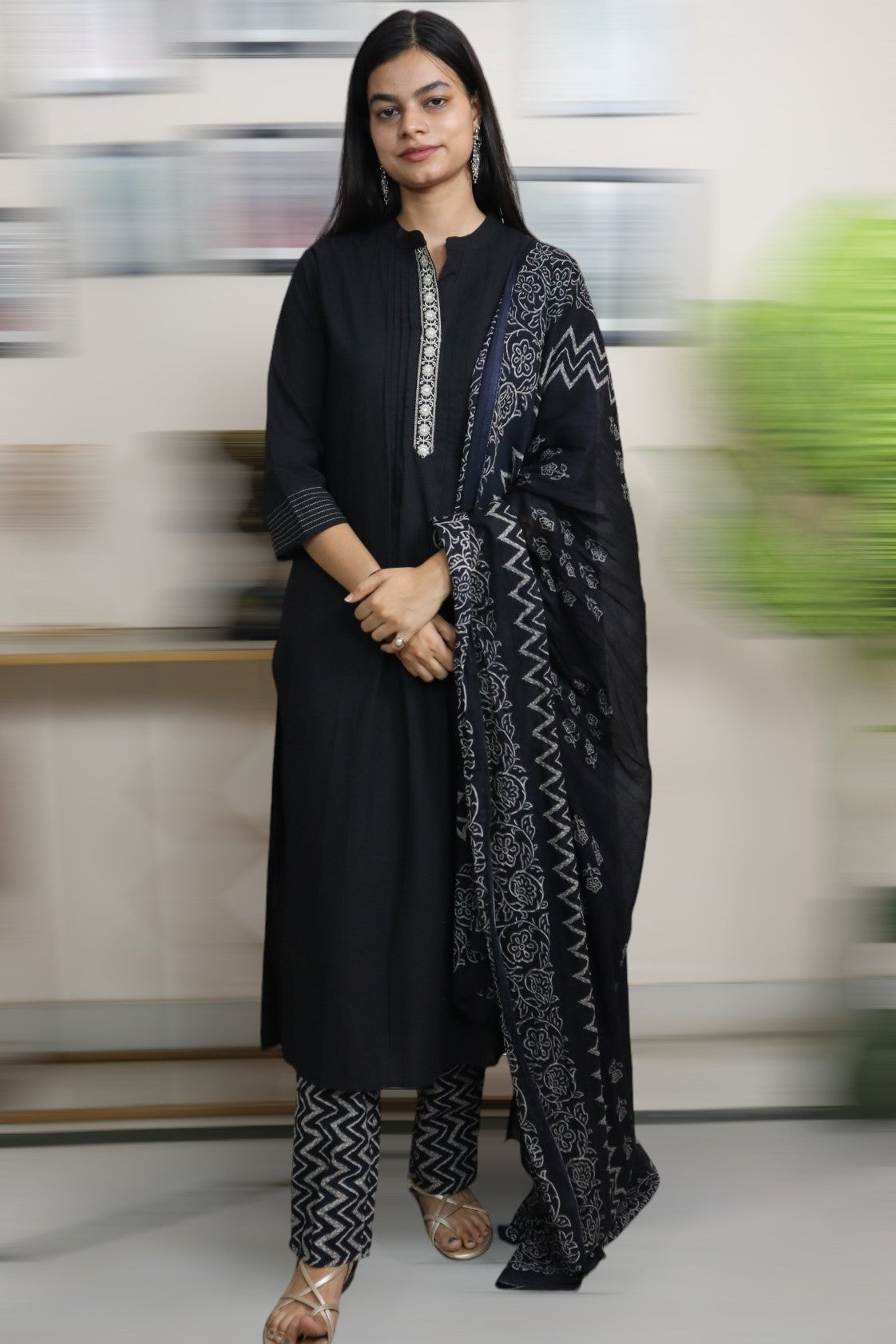 ISHI 767 Beautiful All Black Color Cotton Straight 3 Pcs Suit