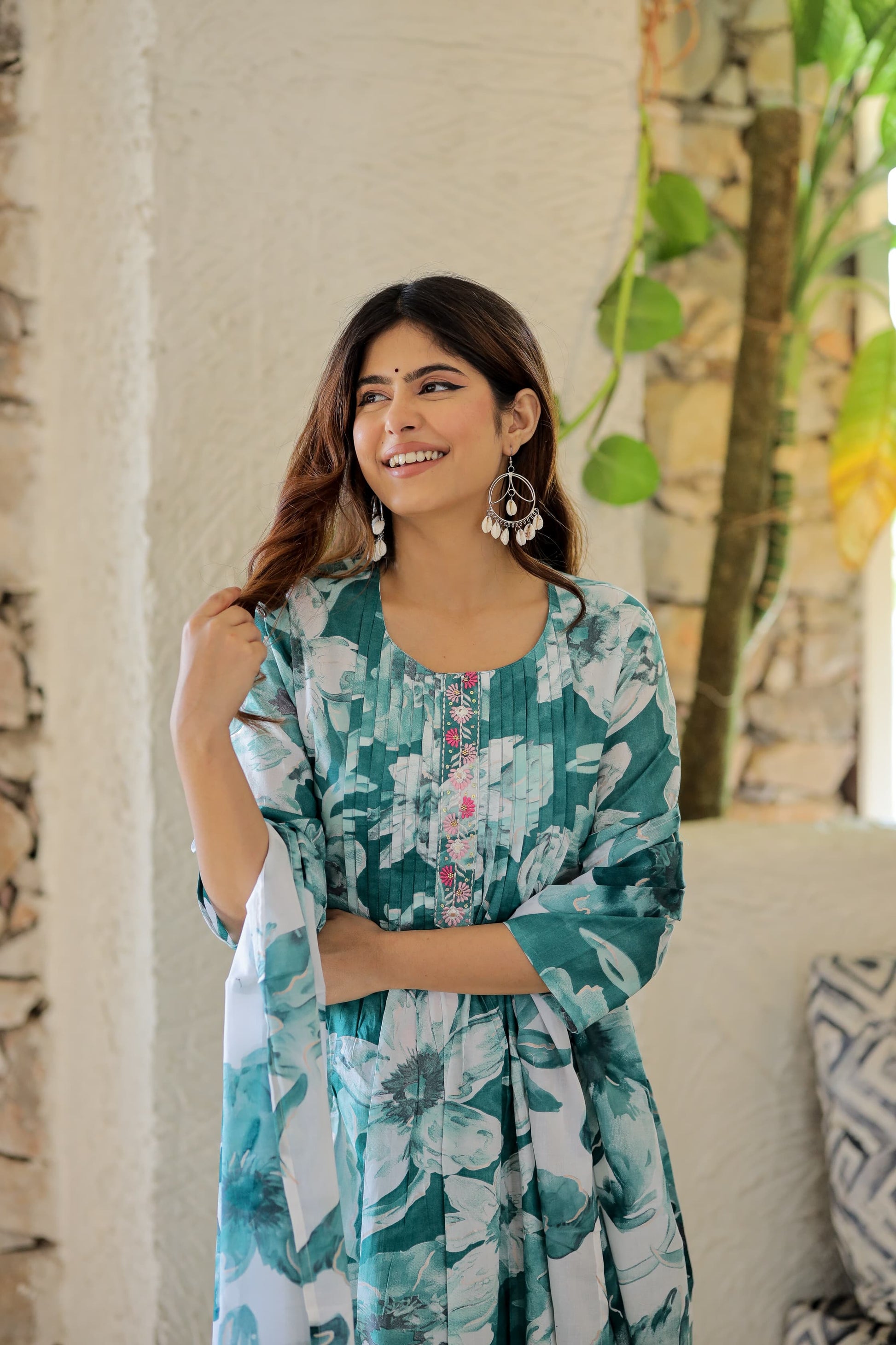 ISHI 780 Beautiful Green Color Floral Cotton Straight 3 Pcs Suit