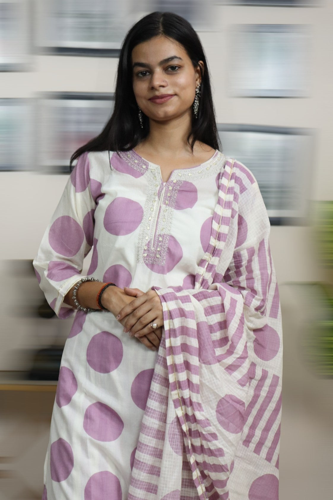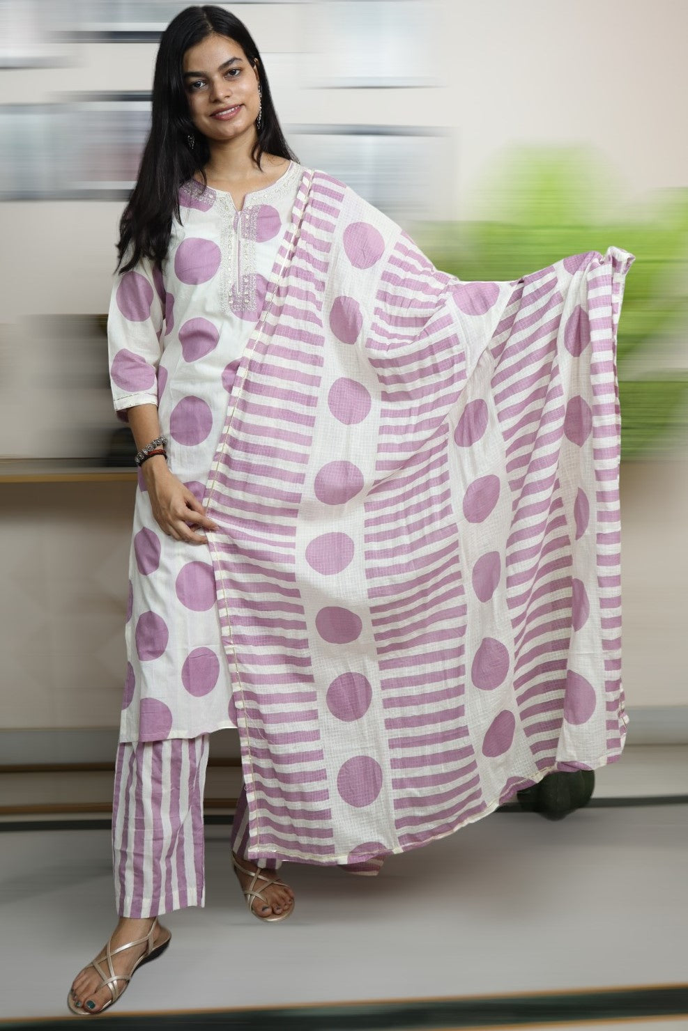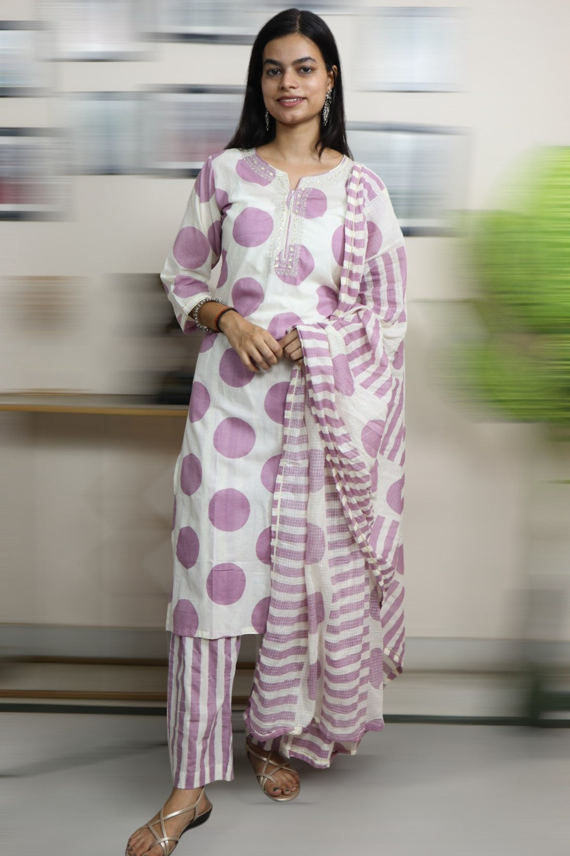 ISHI 801 Beautiful Off White Color Polka Dot Cotton Straight 3 Pcs Suit