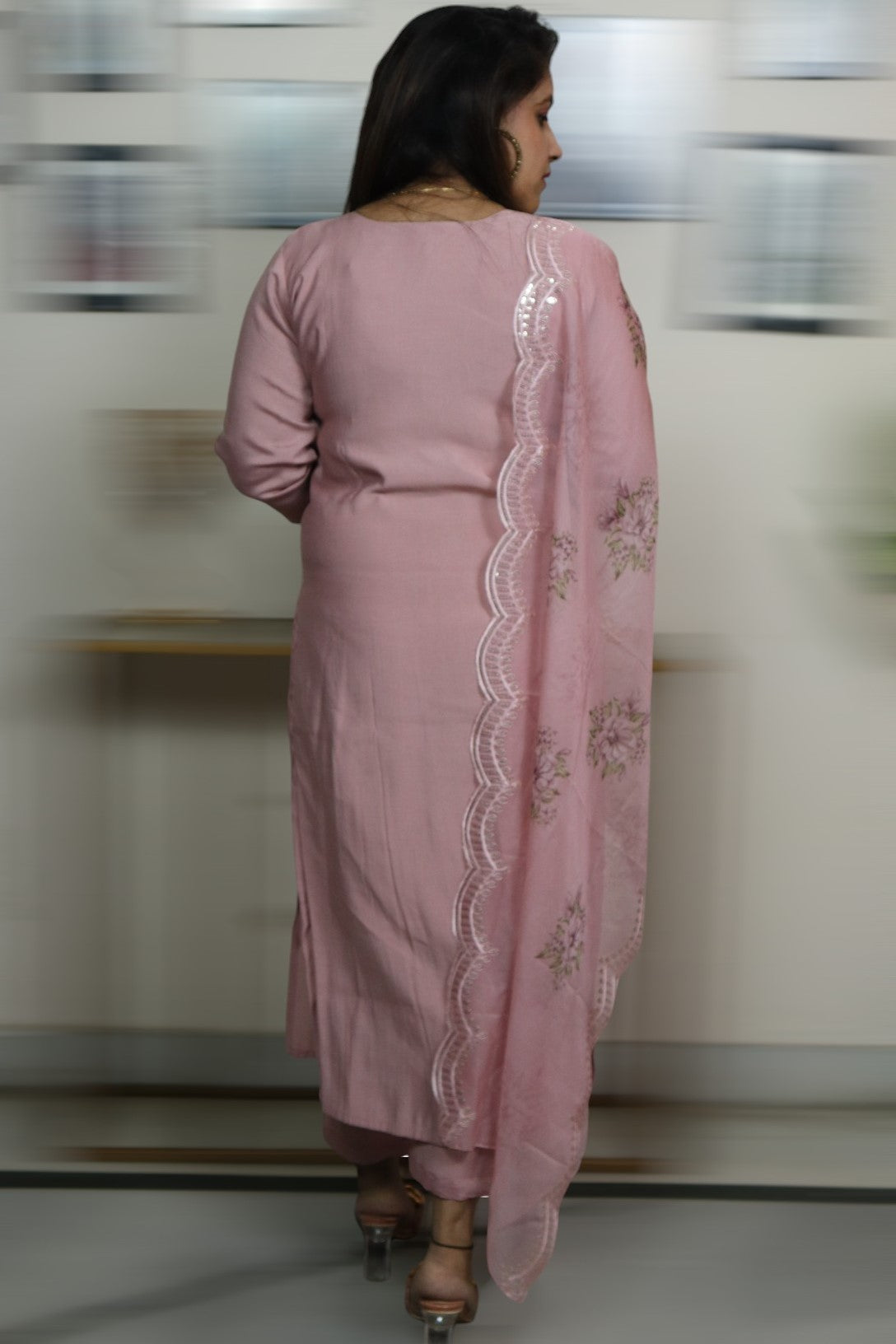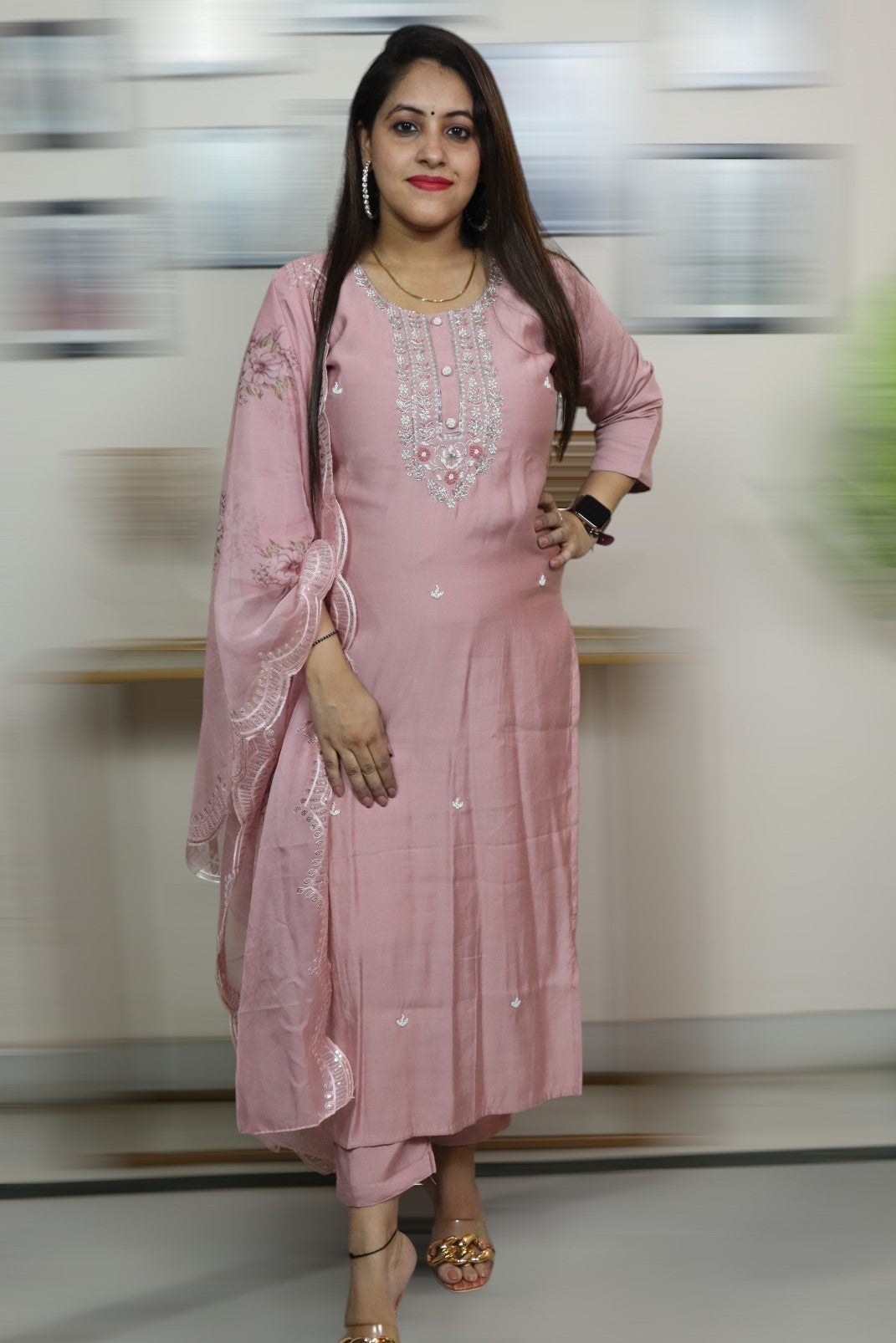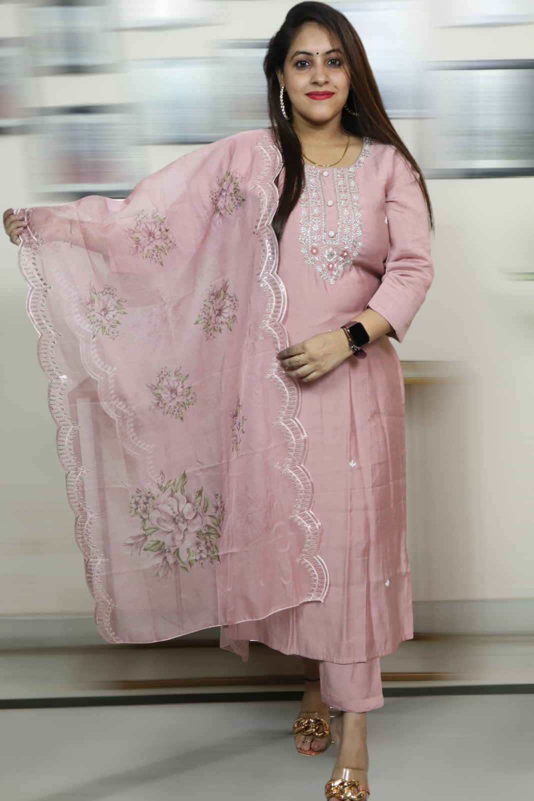 ISHI 862 Beautiful Pastel Pink Color Russian Silk Embroidery Work Patywear 3 Pcs Suit