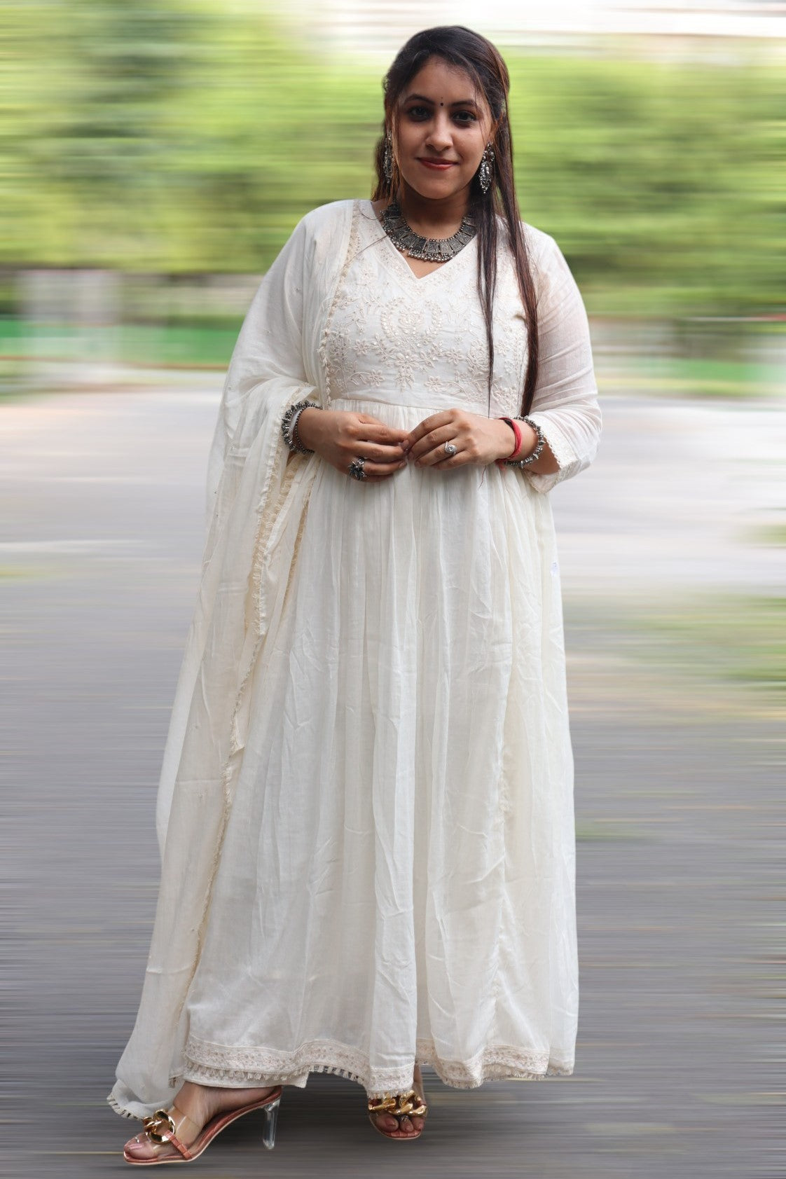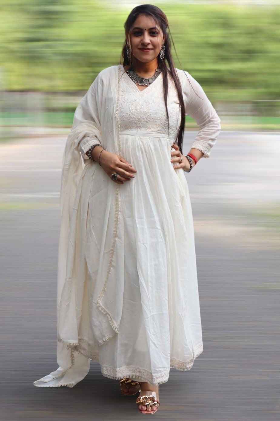 ISHI 864 Beautiful Designer White Color Mal Cotton Anarkali Style 3 Pcs Suit