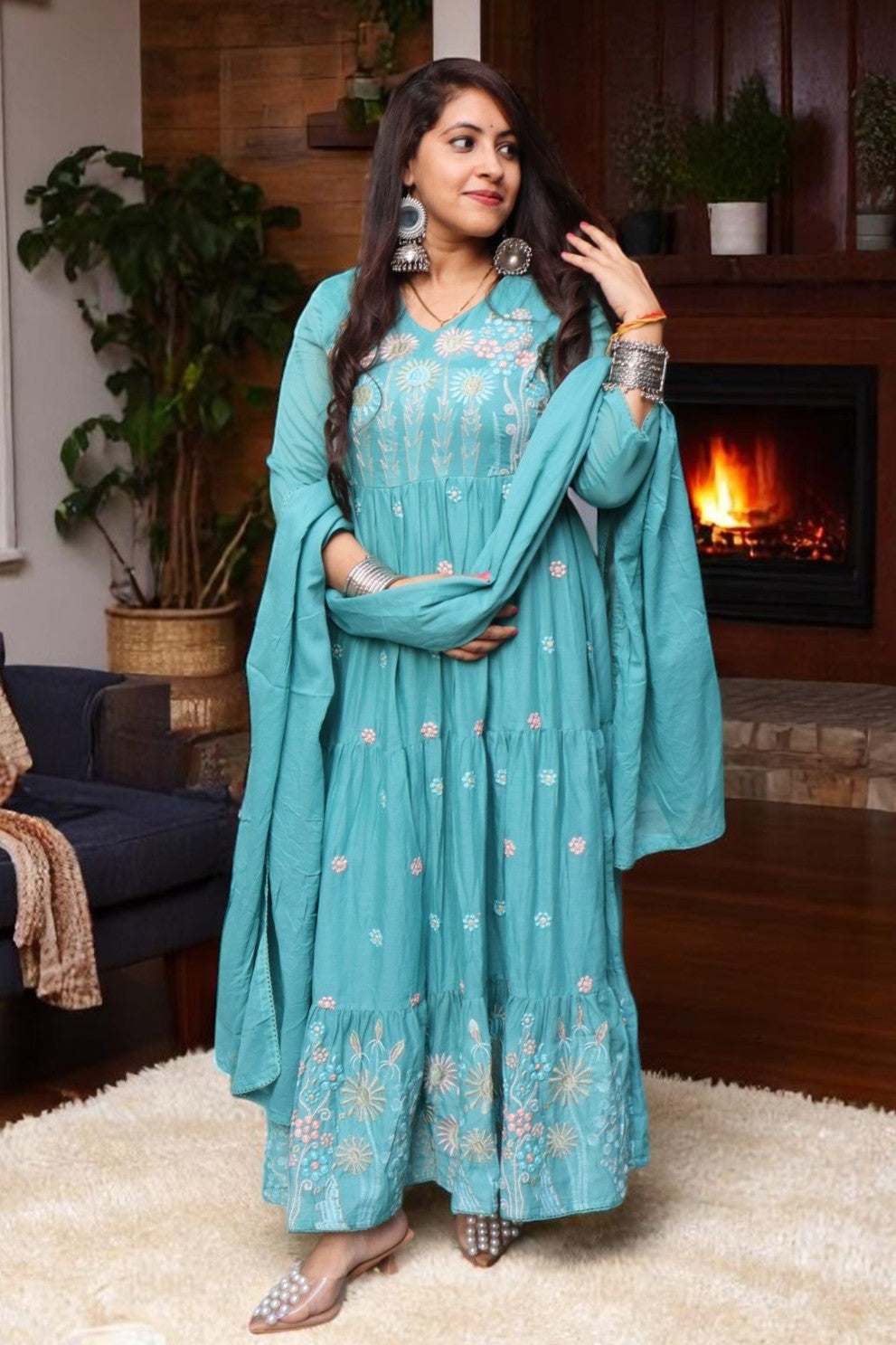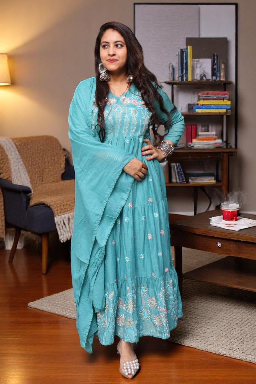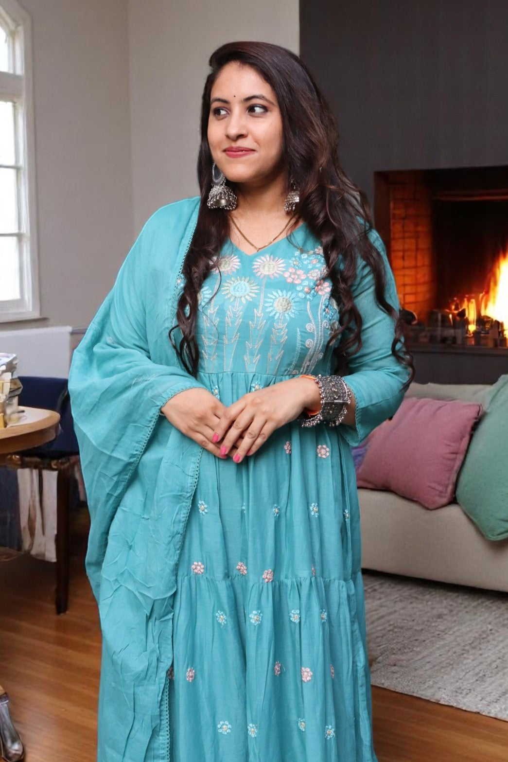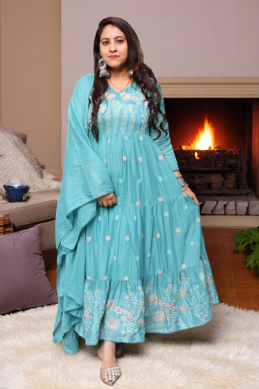 SDA0100 Designer Sea Green Mal Cotton Full Embroided Anarkali 3 Pcs Suit