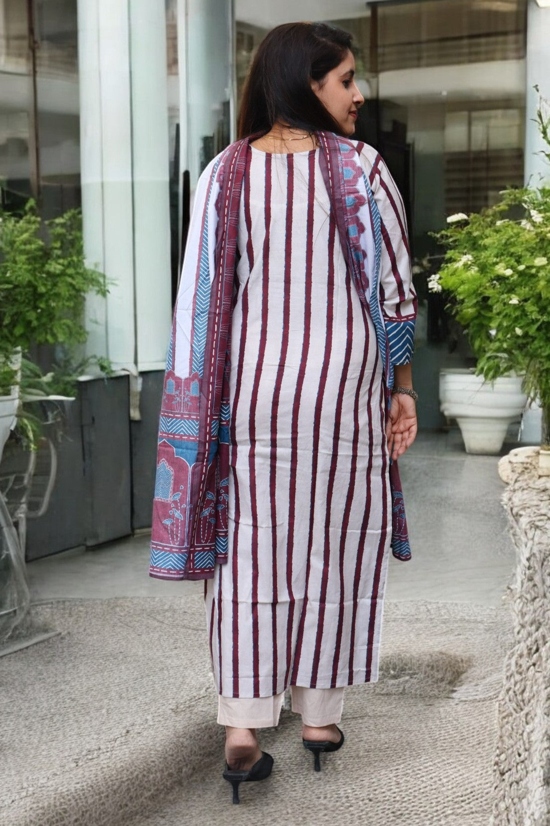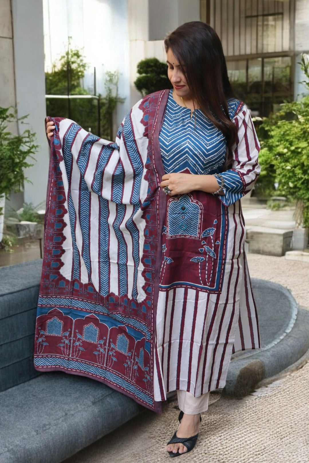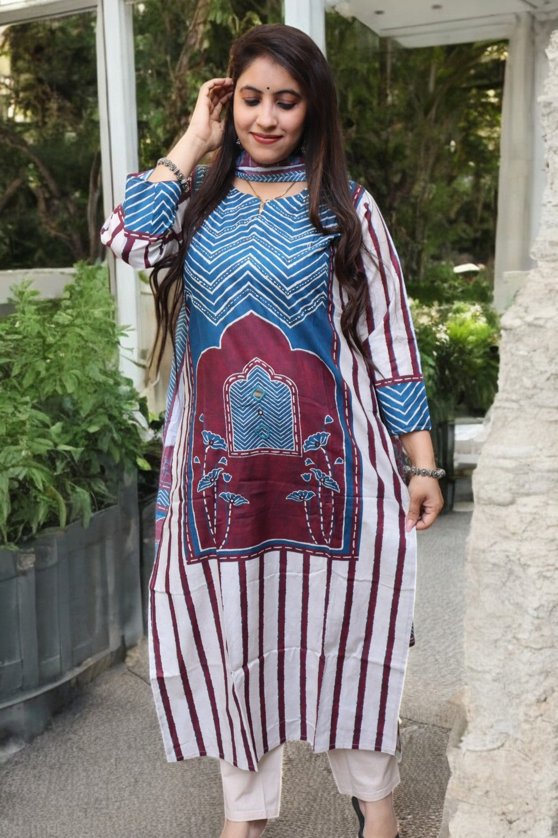 SDE069 Beautiful Multi-Color Gamthi Glace Cotton Braj Bhoomi Printed 3 Pcs Set