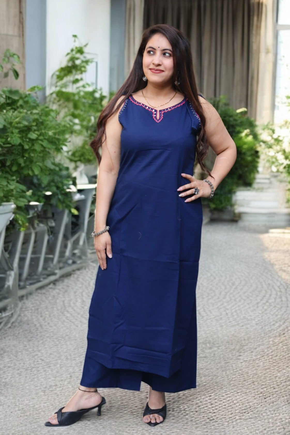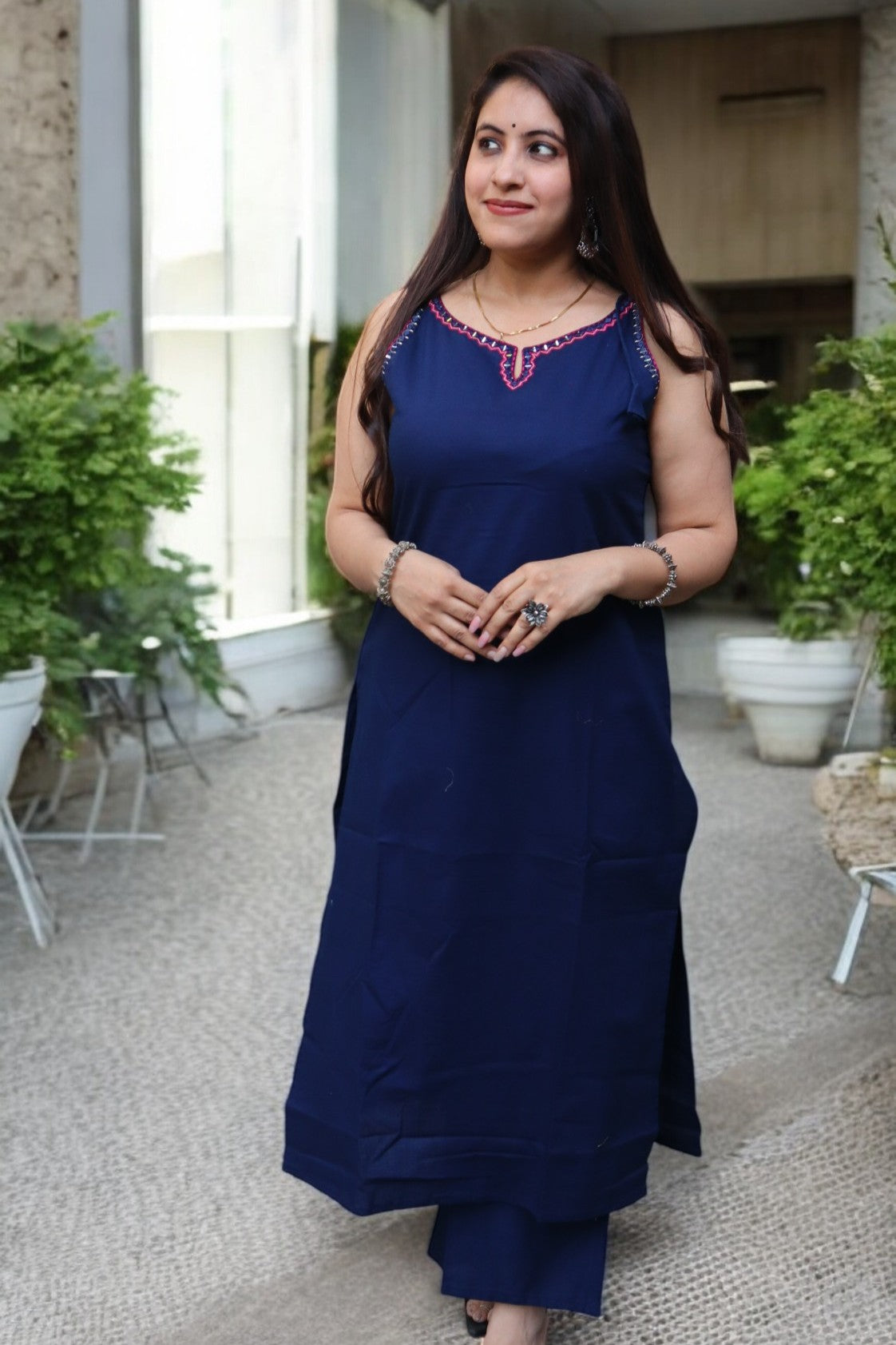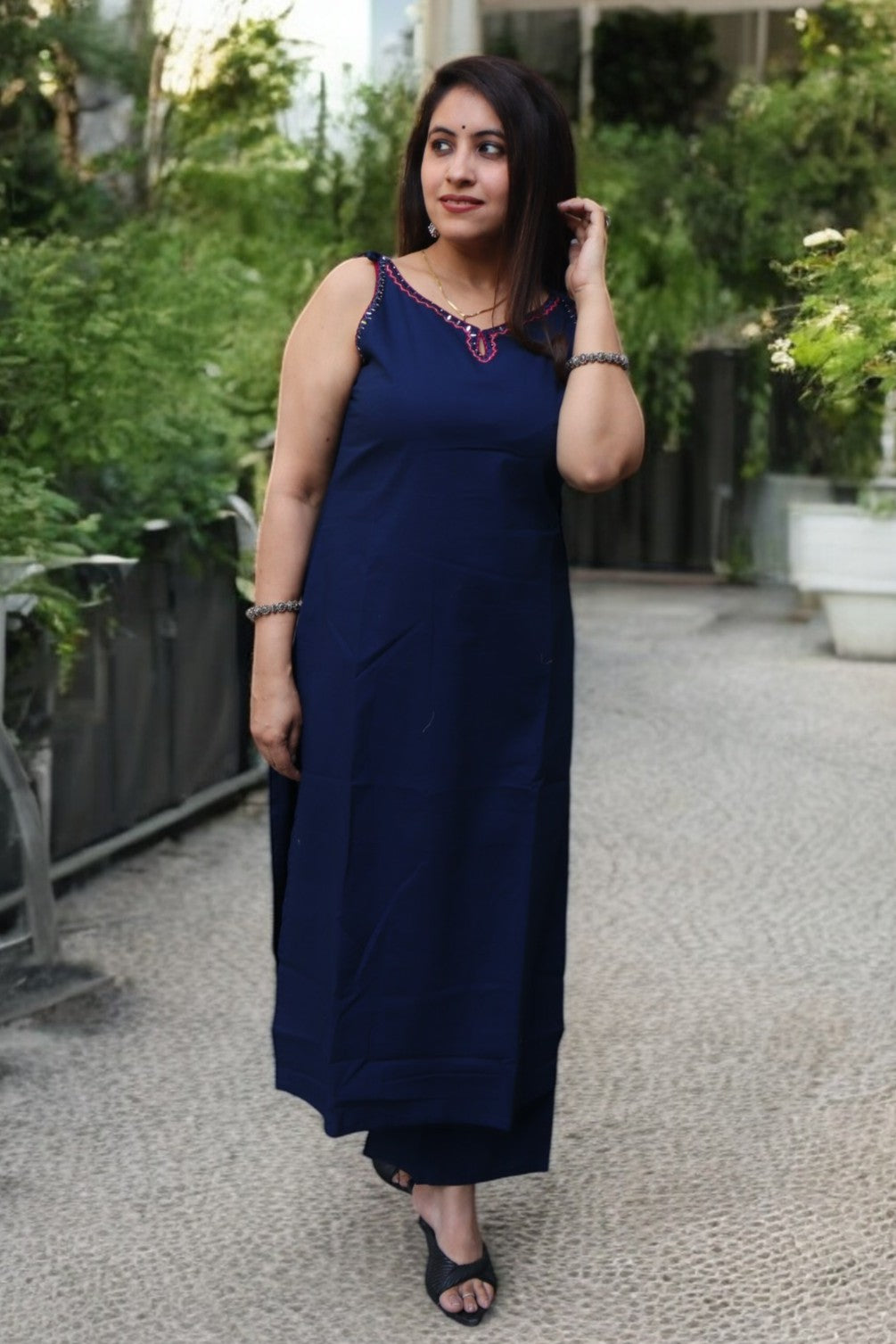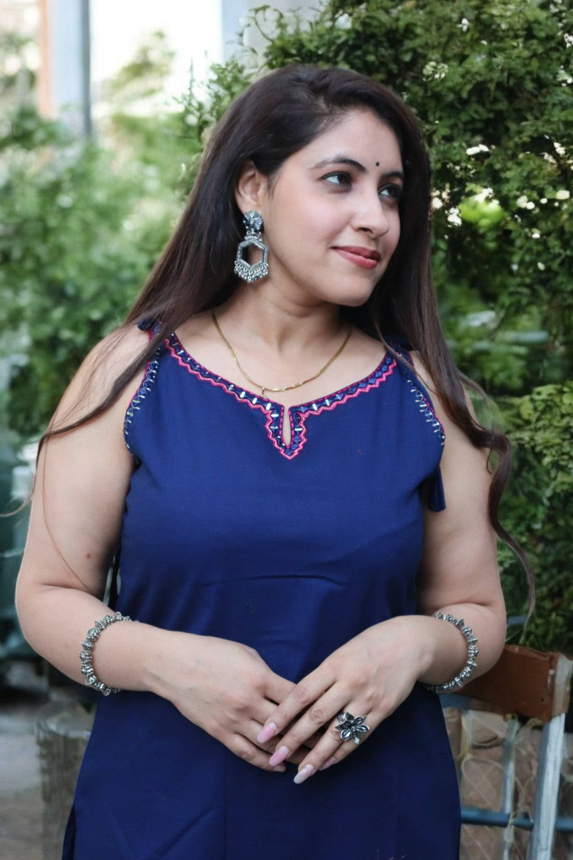 SDE071 Beautiful Navy Blue Color Pure Cotton Strap on Real Mirror Work 2 Pcs Set