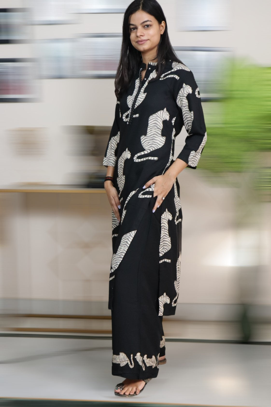 ISHI 812 Beautiful Black Color Tiger Printed Germen Rayon Straight 2 Pcs Suit